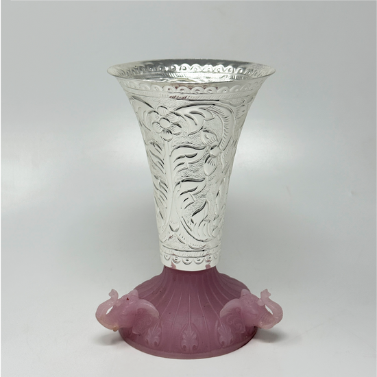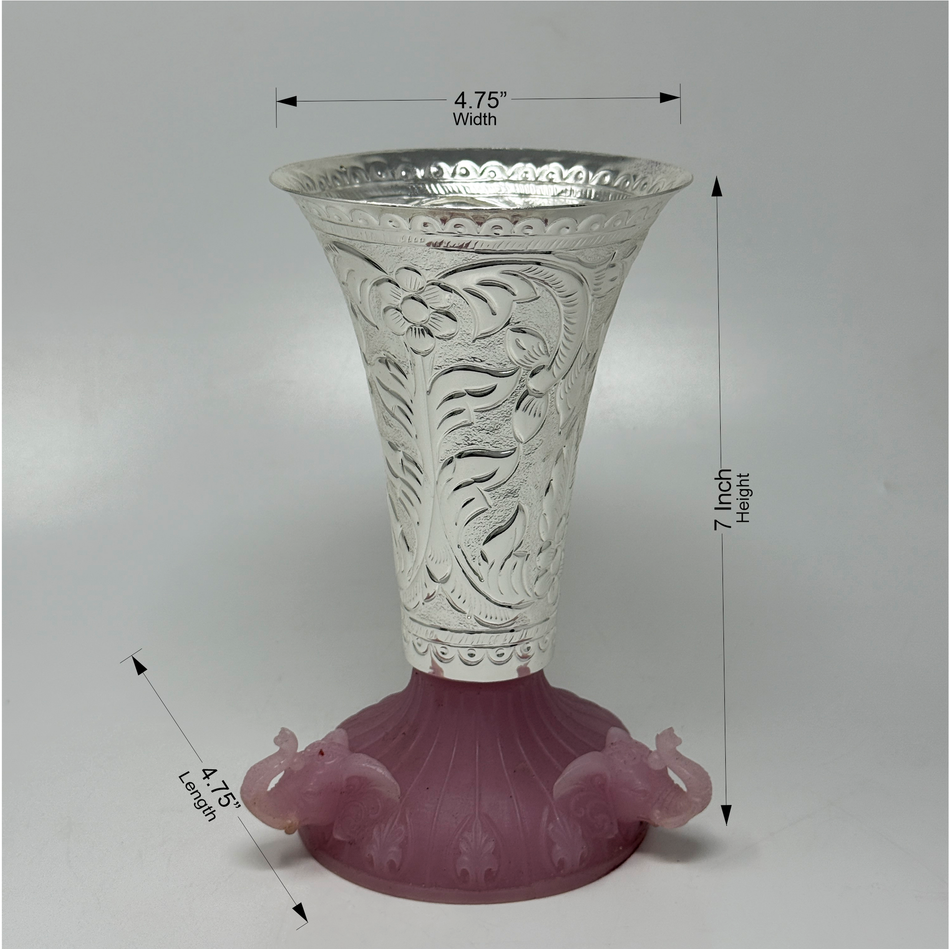 The Traditional Elephant Flower Vase features a brass body with a sophisticated silver-plated finish, combining durability with refined aesthetics. Its sturdy pink resin base not only provides stability but also adds a unique visual contrast. This expertly crafted vase is ideal for showcasing floral arrangements while serving as a timeless decorative accent in any setting.