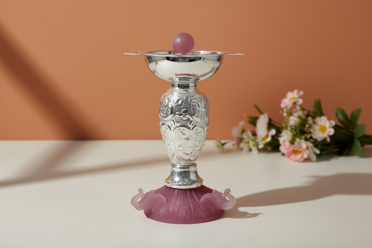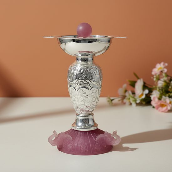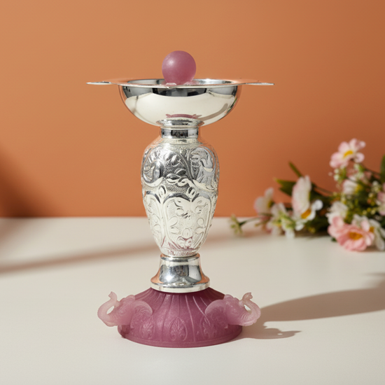 Add a divine touch to your home with this beautifully handcrafted Elephant Samai. Made from premium brass with silver-plated, it features intricate traditional motifs and unique pink resin base adorned with elephant figures, symbolizing wisdom and prosperity.