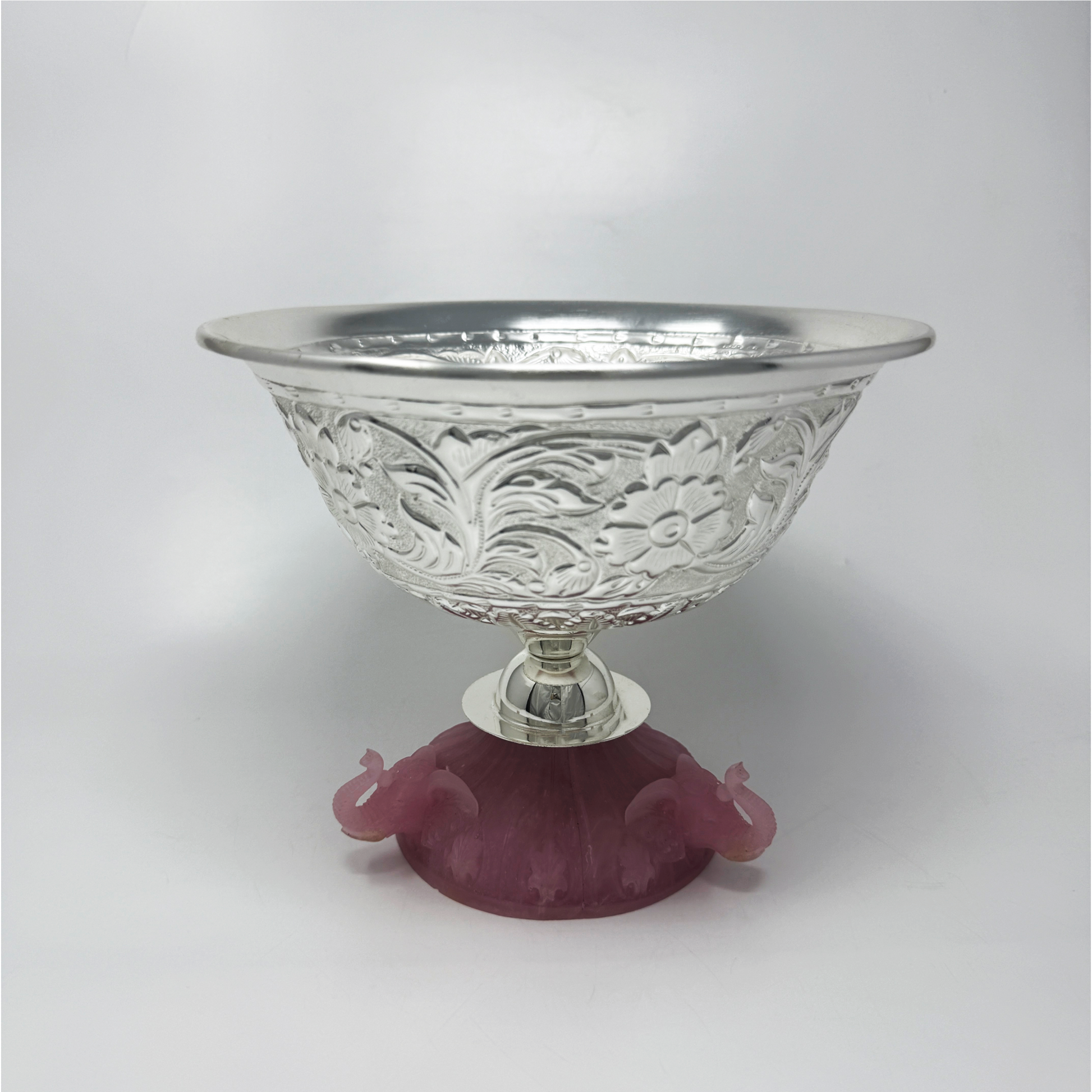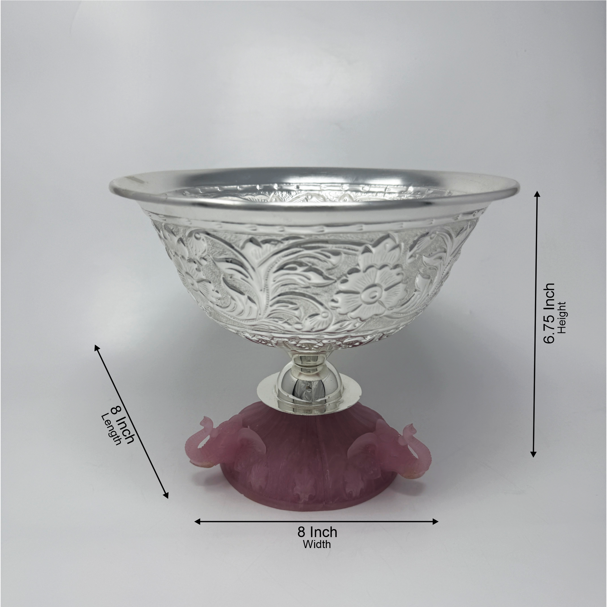 Bring timeless elegance to your home with this beautifully handcrafted Traditional Elephant Silver-Plated Bowl. The bowl is meticulously made from premium brass with silver-plated finish, featuring intricate floral and motif engravings. Its base is designed from pink resin, adorned with traditional elephant figures that symbolize strength, wisdom, and prosperity.