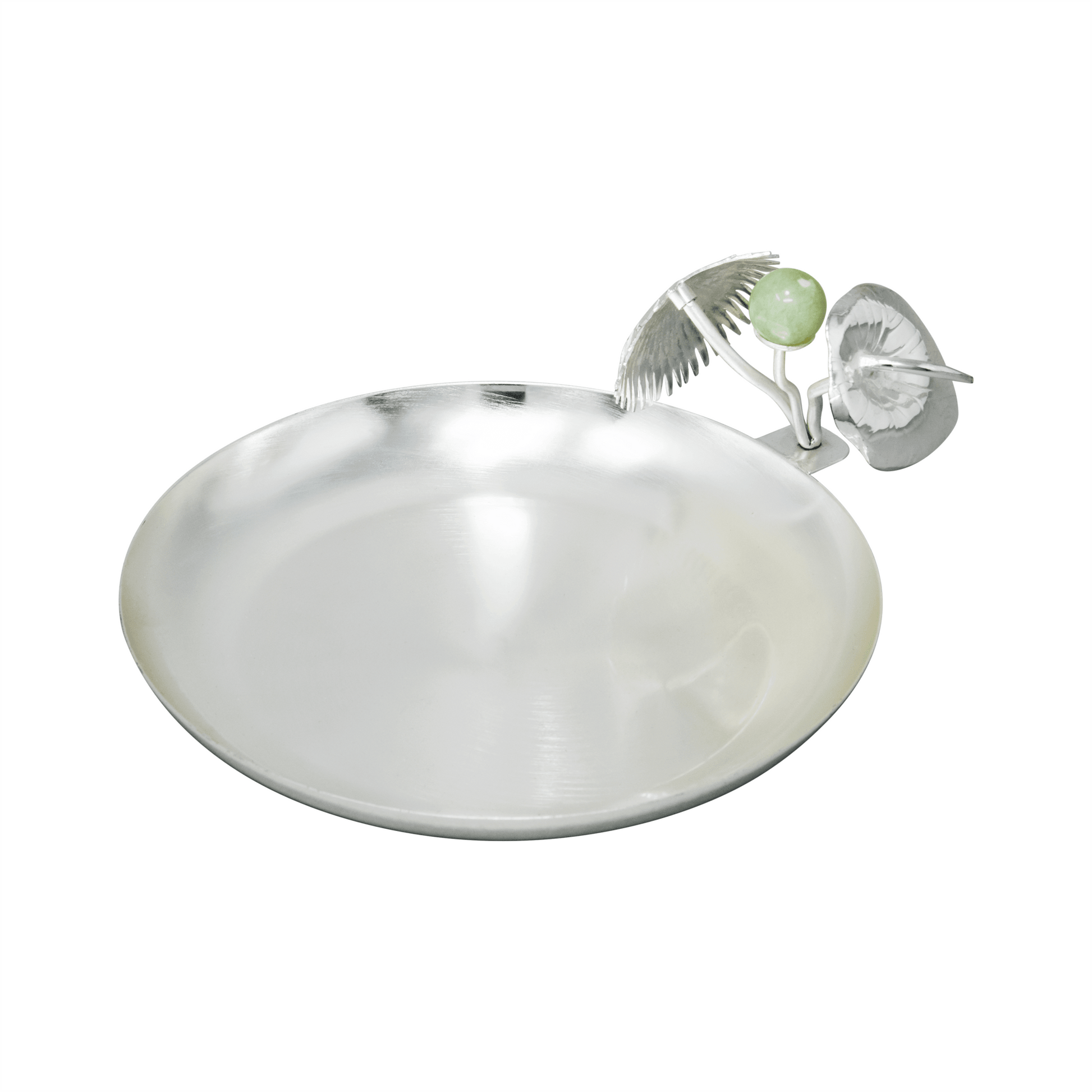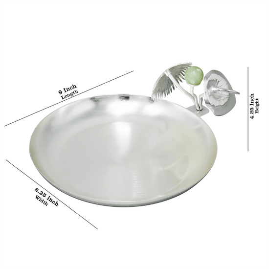 Enhance your dining experience with this exquisite tropical platter, adorned with elegant brass and silver plating. Featuring a striking green aventurine knob, this piece is perfect for adding a touch of sophistication to any table setting.