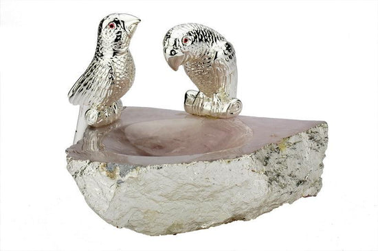 Two Small Parrot Platter on Silver Gilded Rose Quartz