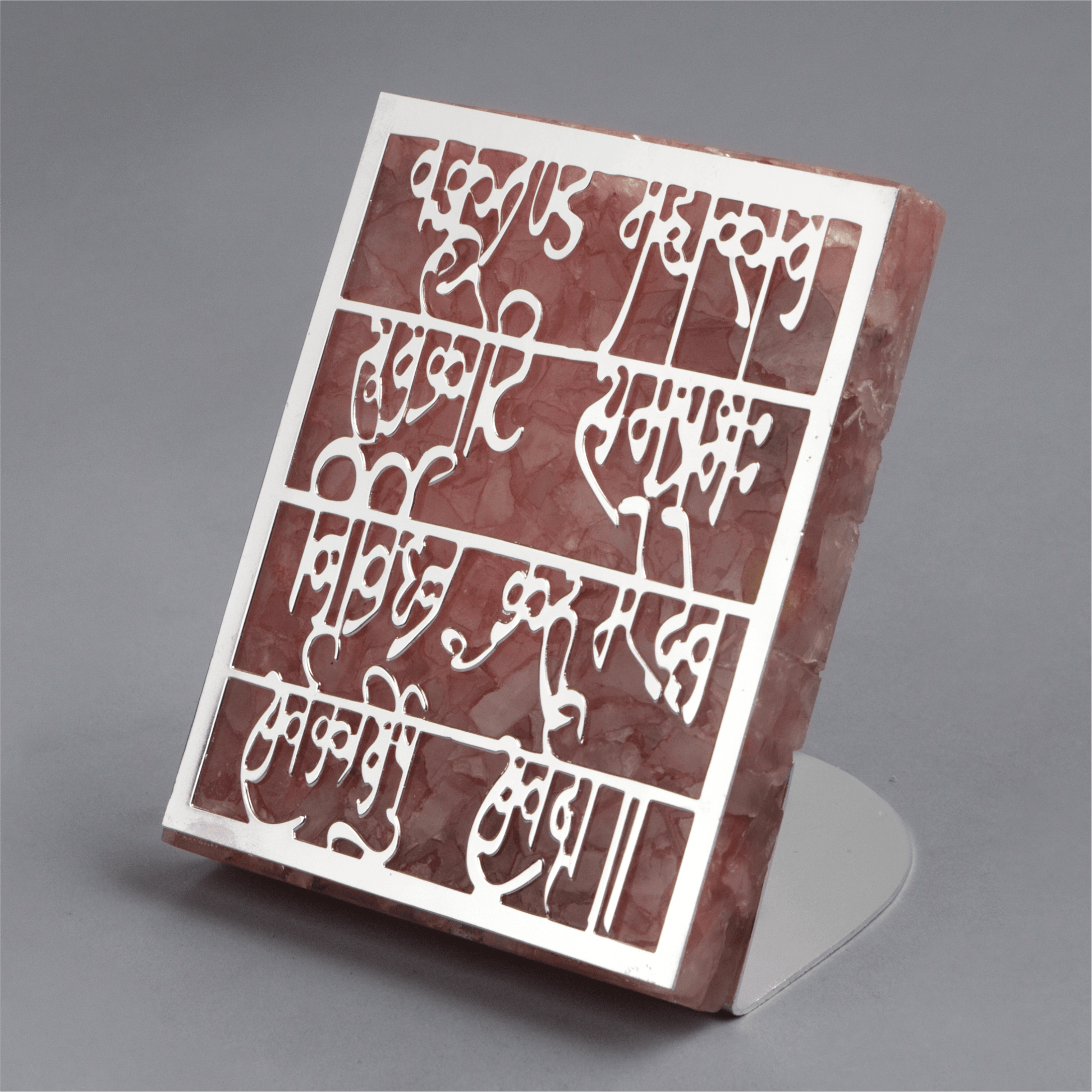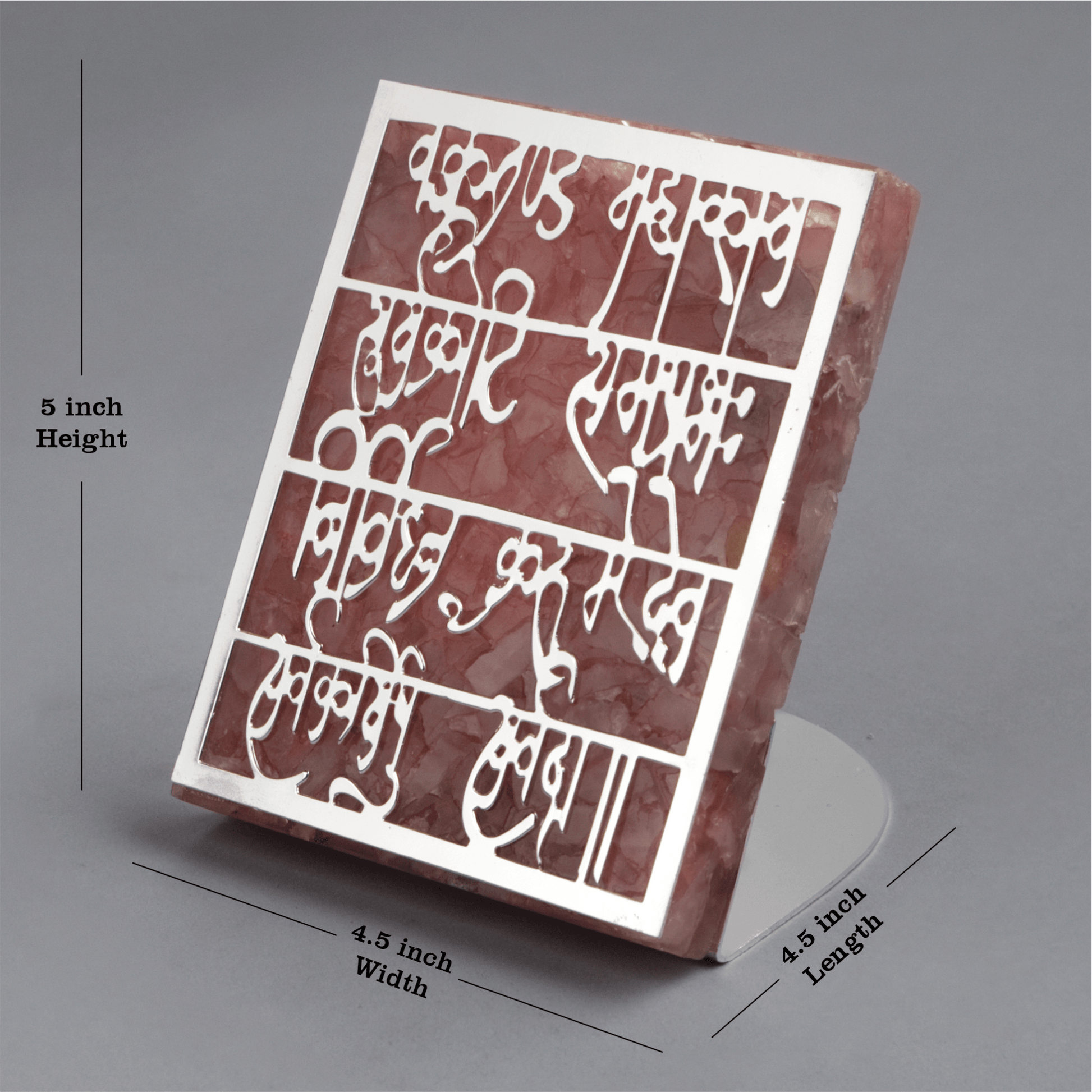 Exemplifying an exclusive blend of design and finesse, this Vakratund Mantra Cut Work Tea Light Holder on Rose Quartz, crafted from rose quartz stone and brass with silver plating, showcases exquisite craftsmanship. It is certain to become a timeless possession for years to come